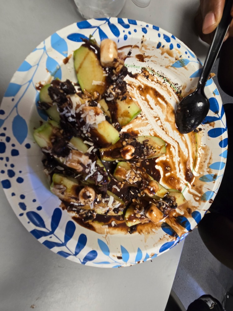 To reward their hard work, they enjoyed dipping crisp green apple slices into a variety of delicious toppings, including chocolate syrup, caramel, crushed Oreos, chocolate chips, Heath bits, marshmallows, chocolate sprinkles, and coconut.