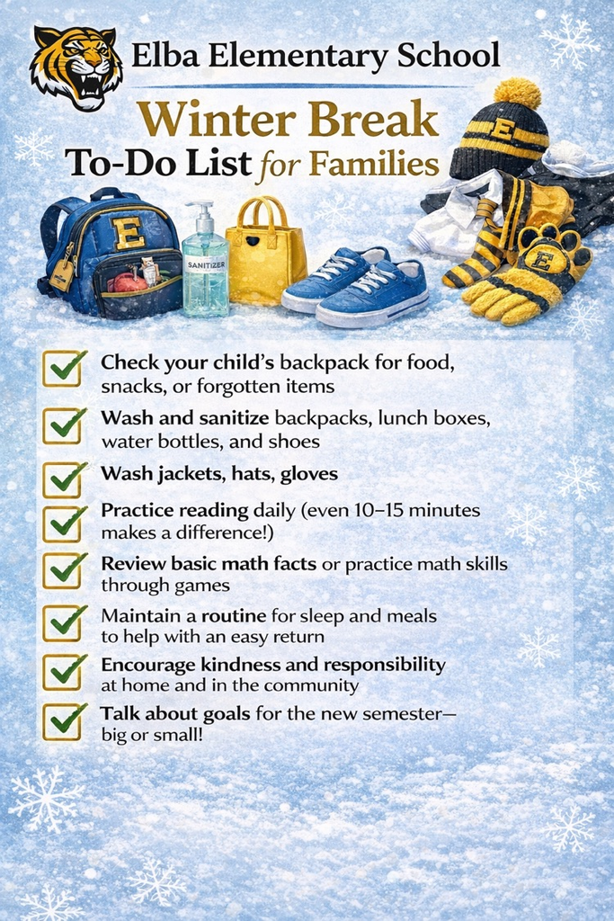 Winter Break is a great time to reset and get ready for a strong return to school. A few simple steps at home can help students come back refreshed, focused, and ready to learn. Take time over the break to clean out backpacks, wash jackets and shoes, practice reading and math skills, and keep healthy routines in place. Small habits now can make a big difference later! We look forward to welcoming our Tigers back recharged and ready for the new semester. 🐅💛🖤